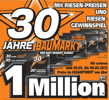Passend zum 30 jährigen Jubiläum gibt Globus Baumarkt eine Angebots-Garantie. Sollte ein Artikel einmal ausverkauft sein, besorgt das Unternehmen den...